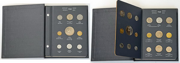 | Description: FAO Coin album 1974-1975, album number 4 (4 pages with 38 coins and 4 stamps). The fourth issue of a coin collection issued in conjunction with the United Nations and the Food and Agricultural Association. Each 1-2 pages were sold by subscription, some pages with quite low mintage figures. In grey album of issue (marks to cover), some coins toned. Rare. UNC |
