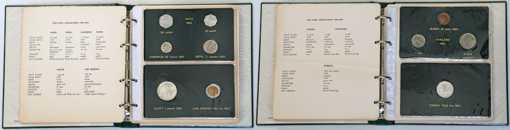 | Description: FAO World Money collection 1981-1983, set of 28 coins over 6 pages. Issued in conjunction with the United Nations and the Food and Agricultural Association and sold by subscription. Includes 5 in silver and a few Proof. In green album of issue, some coins toned. UNC-FDC |