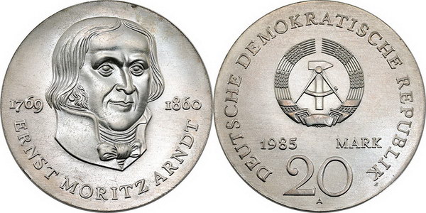 East Germany DDR silver 20 Mark 1985A, Ernst Moritz Arndt commemorative (0.500, 20.9g). Bright mint lustre.