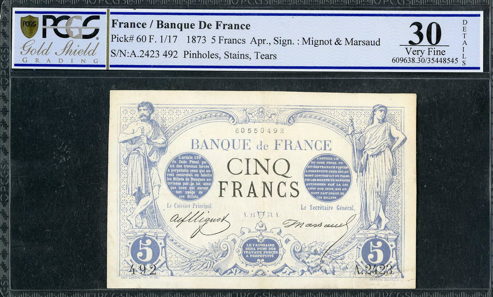 France 5 Francs 1873 (P 60F). PCGS graded 30 Very Fine DETAILS (35448545). Pinholes, stains and tears, but scarce.