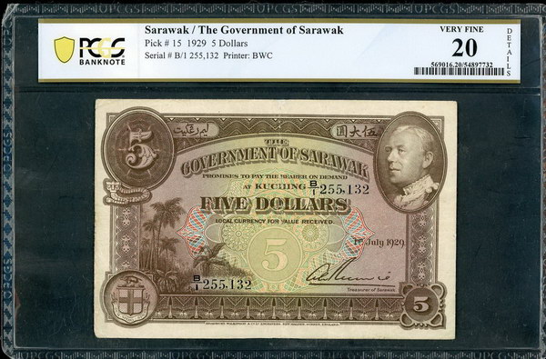 | Description: Sarawak Government 5 Dollars Kuching 1-7-1929 (P 15). PCGS graded Very Fine 20 DETAILS (54897732). Small repairs. Rare. |