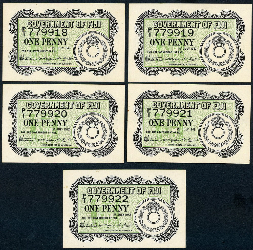 Fiji Emergency issue 1 Penny 1-7-1942 (P 47a). Issued. Consecutive run of 5.