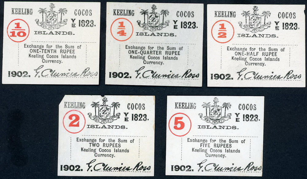 | Description: Keeling Cocos Islands set of 5 parchment exchange notes 1902: 1/10th Rupee, Quarter Rupee, Half Rupee, 2 Rupees and 5 Rupees (P S123-127). Small edge clip to 1/2 and 1/4, corner cut of 2 Rupee. (5 notes total). gEF-UNC |