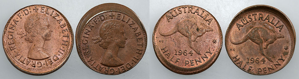 1964Y (2). Both struck approx 2-3mm off-centre with partial raised rim lips. Brown with red. (2 coins total).