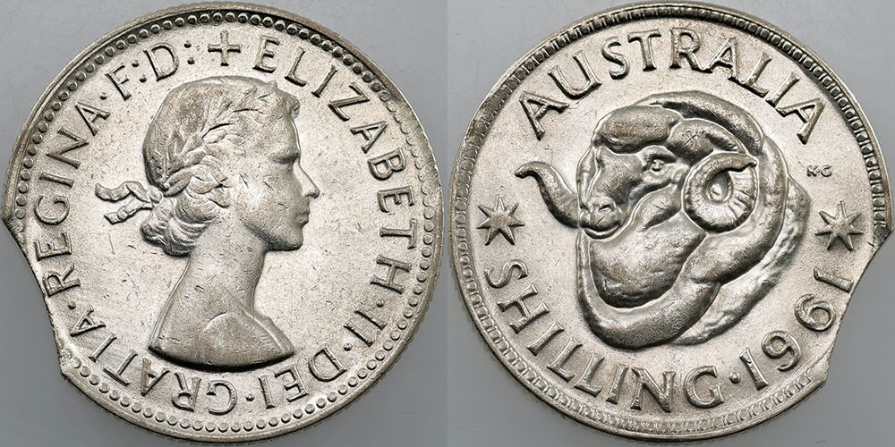 Shilling. 1958. Curved edge clip 5mm. Some tone...