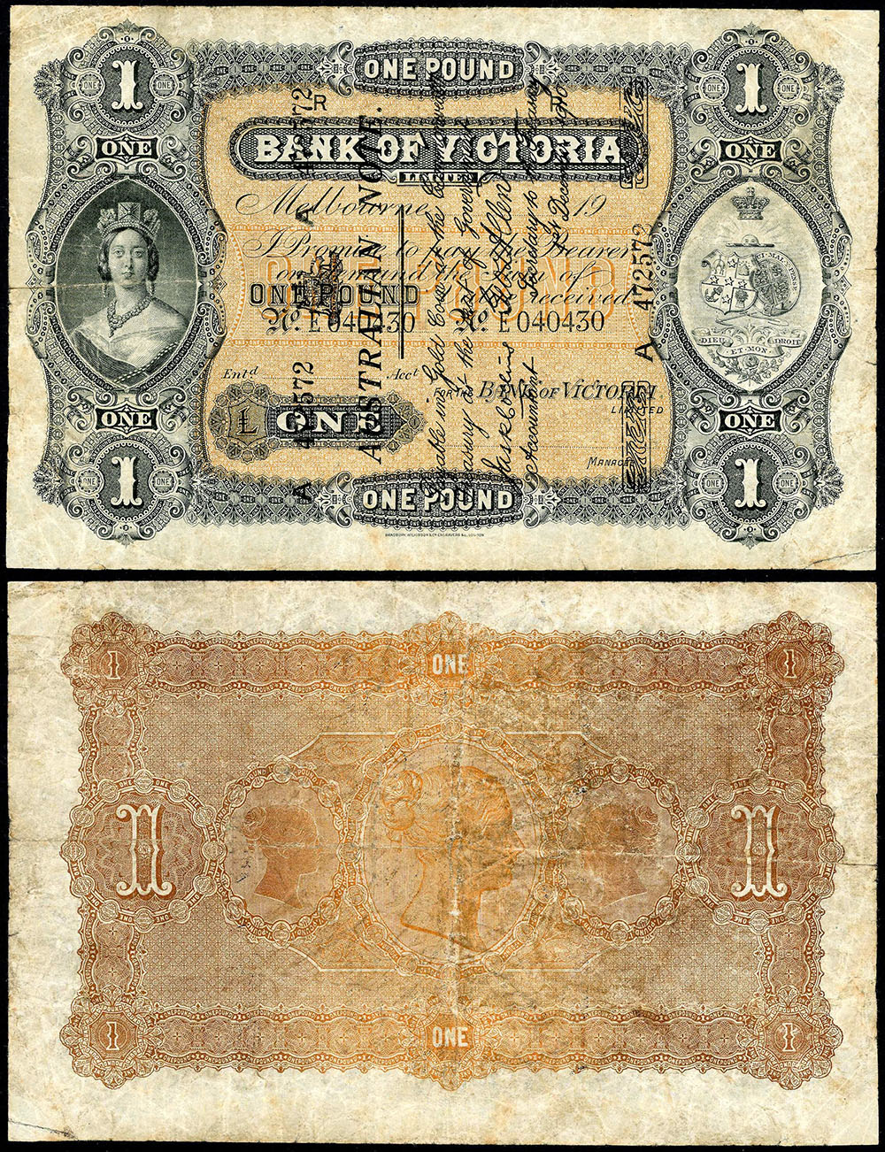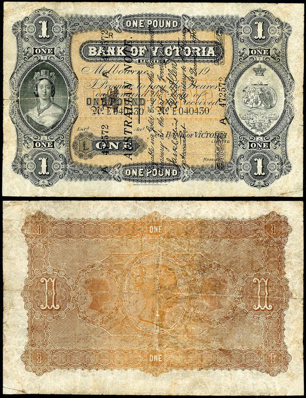 | Description: 1910 The Bank of Victoria Limited Melbourne, Vic superscribed Australian note Collins-Allen 1-12-1910, A 472572 (S 21). Folds, lower right corner re-attached, minor edge tear repair, multiple pinholes and a minor edge split and separation, but with good eye appeal and very rare. With tag as sold previously for $155,000. FINE |