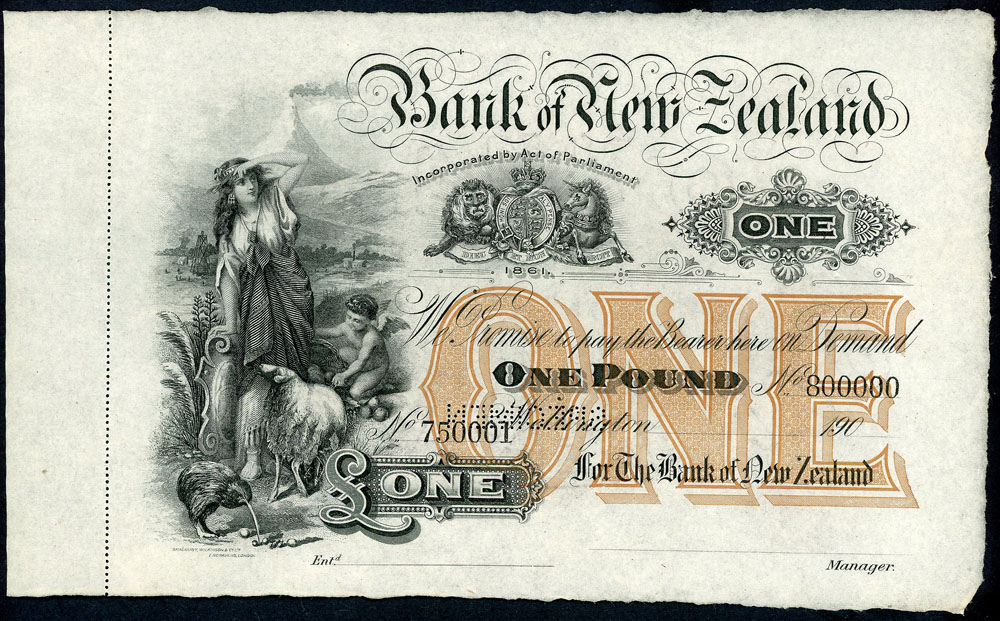 | Description: New Zealand, Bank of New Zealand 1 Pound specimen, Wellington NZ 190- (P S206). By Bradbury, Wilkinson and Co Engravers, perforated SPECIMEN in retrograde in lower centre with perforated margin intact. Flicks and some handling. Rare. With tag as sold previously for $10,500. gEF |