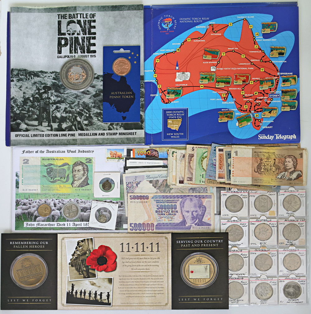 | Description: Small collection of assorted coins, notes and mint issues. Includes Australia: 2020 Penny token on card, $1/20 Cent on card 2011, commemorative 50 Cents 1991-2016 (12), Australian War Memorial Lest We Forget 2-medallion set 11.11.11 in pack, Battle of Lone Pine medallion and stamp mini sheet with Lone Pine wood shavings 2008 in pack, Sydney 2000 torch relay 14 pins in map folder, circulated 1 Dollar notes (5) and world: Ottoman small silver coin (holed) and medallion and assorted world notes (Uganda, Iran, NZ, Peru and others; 41 total). (60 items total). POOR-UNC |