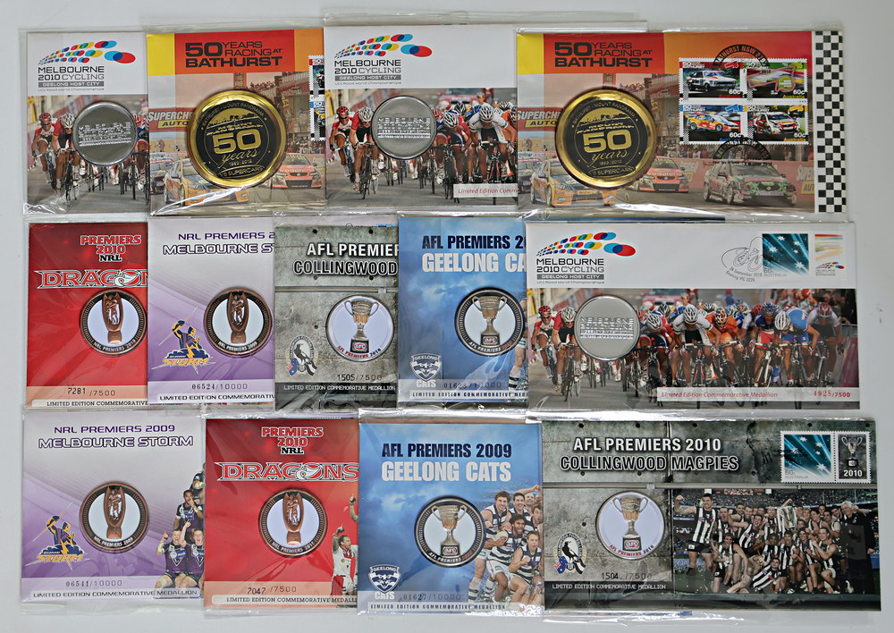 | Description: Medallic Sports themed coloured First Day Covers: NRL 2009 Melbourne Storm (2) and 2010 Dragons (2), AFL 2009 Geelong Cats (2) and 2010 Collingwood Magpies (2); 2010 Melbourne Cycling (3) and Bathurst 50 Years (2). (13 items total). UNC |