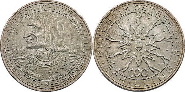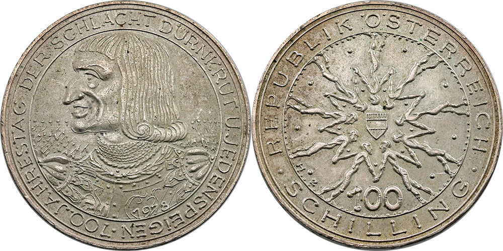 Austria 100 Schilling 1978. Anniversary of the Battle of Durnkrut. Light tone.