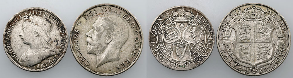 1923 George V. Also Florin 1900 Victoria. Toned. (2 coins total).