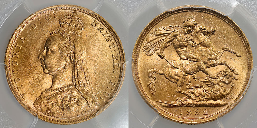 | Description: 1892S St George Reverse. Victoria Jubilee head. PCGS graded MS 62 (57525373). Light tone with soft bloom. UNC/Ch.UNC |