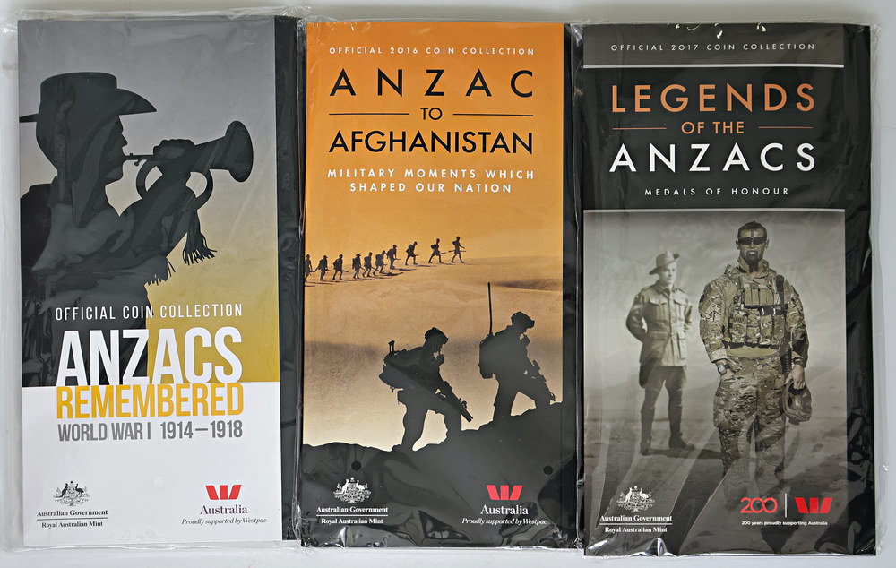 | Description: 2016 Anzac to Afghanistan, 2017 Anzac Legends, 2018 Anzac Spirit; 20 Cent 14-coin collections in folders. Retail for approx $100 each. (3 items total). UNC |