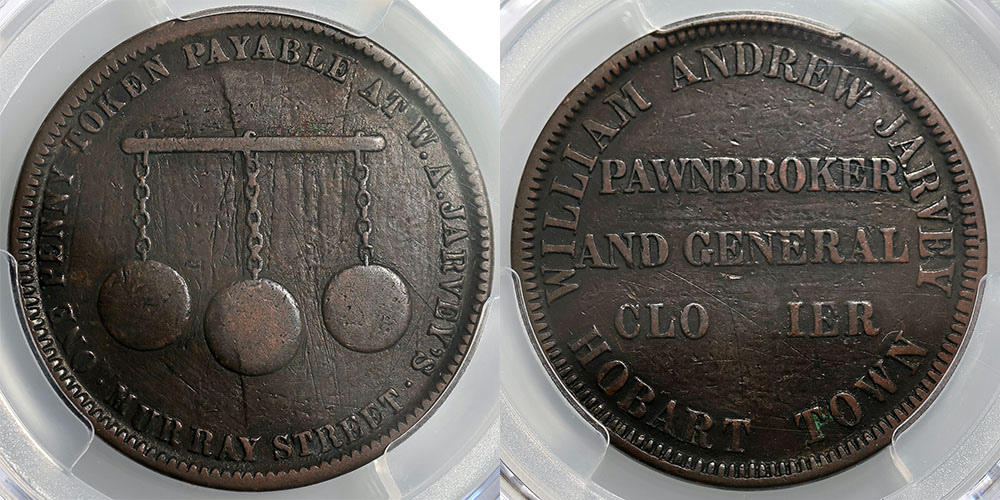 | Description: Jarvey, William A, Hobart Town Tas N/D (1862) (R 302/A 302) copper Penny token. Dark brown, Rarity 8. PCGS graded Genuine- Tooled - VF DETAILS (49752653). Scarce. Ex Noonans UK Oct 2023 (lot 1026) (since graded). aVF |