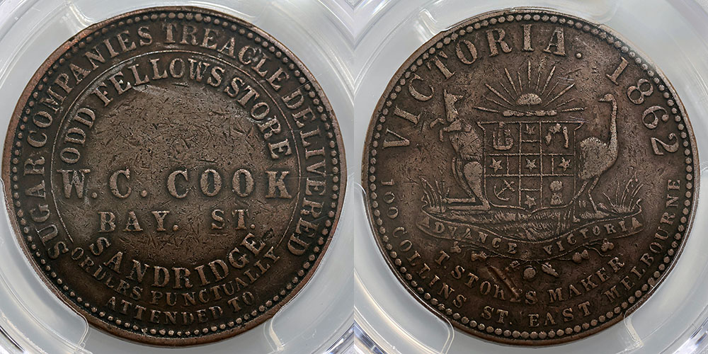 | Description: Cook, W.C, Sandridge Vic 1862 (R 84/A 75) copper Penny token. Dark brown, Rarity 6. PCGS graded VF 35 (49752638). Pop 1 and the only example graded. Ex Noonans UK Oct 2023 (lot 1059) (since graded). aVF |