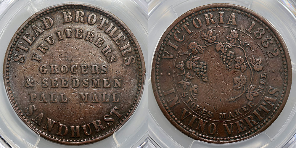 | Description: Stead Brothers, Sandhurst Vic 1862 (R 486/A 504) copper Penny token. Vine branch Reverse, brown, Rarity 6. PCGS graded VF 35 (49752637). Pop 1 and the only example graded. Ex Noonans UK Oct 2023 (lot 1058) (since graded). aVF |