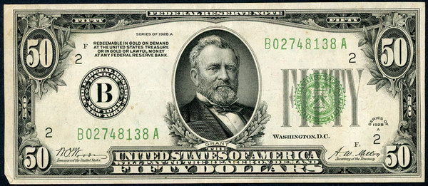 United States 50 Dollars 1928A (P 423a). Gold bearing issue. Corner folded, slight stains on back and a few old folds.
