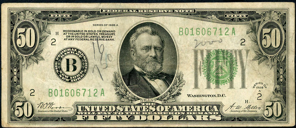 United States 50 Dollars 1928A (P 423a). Gold bearing issue. A few old folds and paper tone, edge split at top, pencil notations on front.