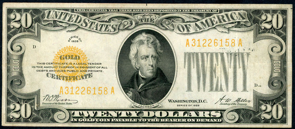 United States 20 Dollars 1928 (P 401). Gold Certificate issue. Five digits printed on back in black ink, a few folds and light paper tone with good colour.