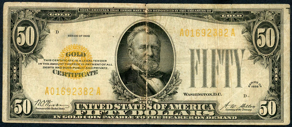 | Description: United States 50 Dollars 1928 (P 402). Gold Certificate issue. A few old folds with heavy centre fold and a couple edge nicks, graffiti removed from back with stamps in back margin. Scarce. FINE |