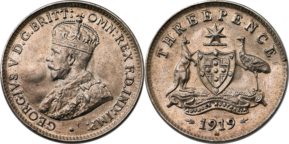 Threepence. 1918M, 1919M. First with brilliant...