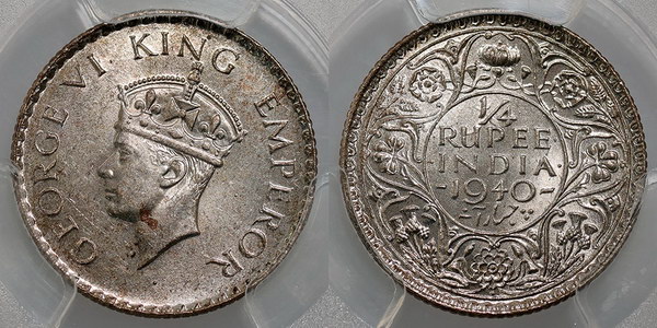 India Quarter Rupee 1940B. PCGS graded MS 63 (32897764). Short trefoils. Bright bloom.