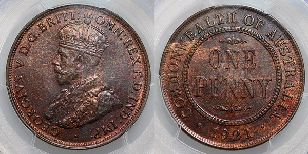 1921. PCGS graded MS 63 RB (26779556). Dark brown with hints of red.