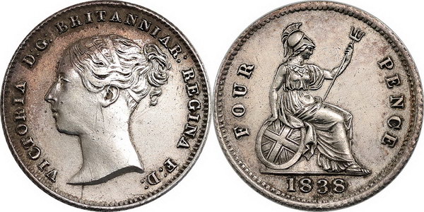 Fourpence Victoria silver 1838. Cleaned/rubbed of tone.
