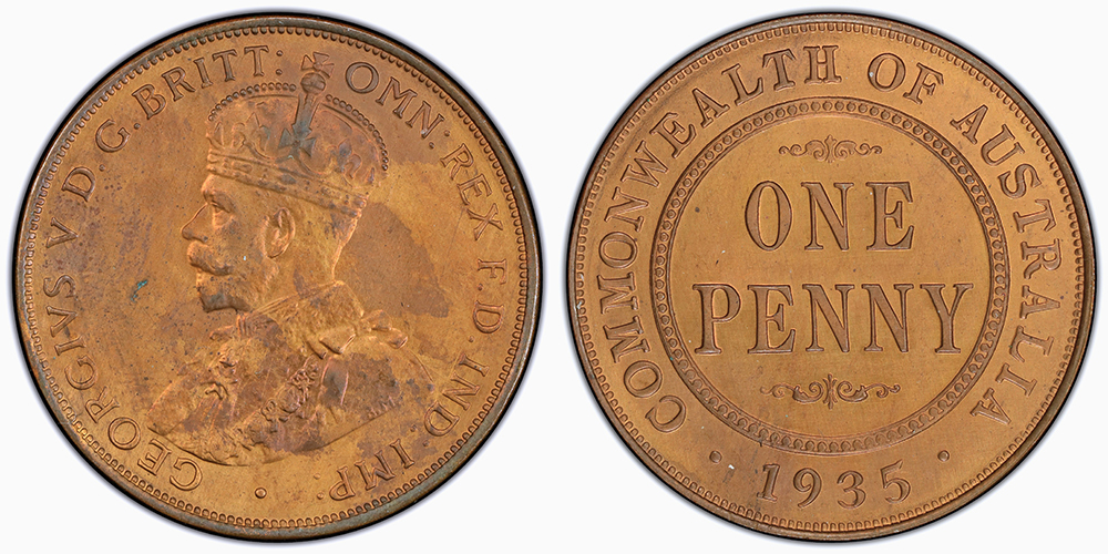 | Description: 1935 Proof Penny. PCGS graded PR 65 RB (49983663). Mostly mint red lustre with good fields and sharp rims. Only one example graded higher. Rare as such. FDC |