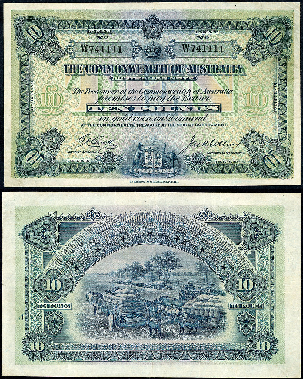 | Description: 1918 Cerutty-Collins (R 52b). Prefix W. Book-flattened of folds and creases and a little dirty at top R/H corner, but with good colour. A nice example and the perfect type note. Ex The Keith Deutscher collection, Max Stern 1977. Very rare. aVF/VF |