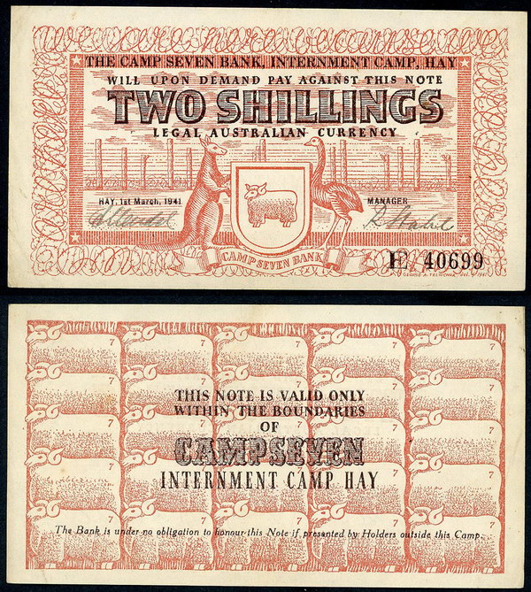 Two Shillings Hay Internment Camps note 1941 WW II. Camp 7, Mendel-Stahl. Some light creasing/bends and slight paper tone. Rare.