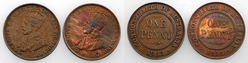 1933/2 Overdate. One once cleaned. (2 coins total).