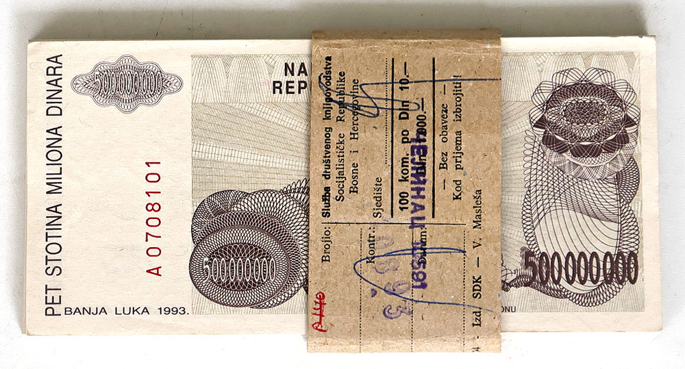 Bosnia and Herzegovina 500,000,000 Dinara 1993 (P 155a), bundle. Uncounted, but appears to have 100 consecutive notes. High retail value of approx $1500.