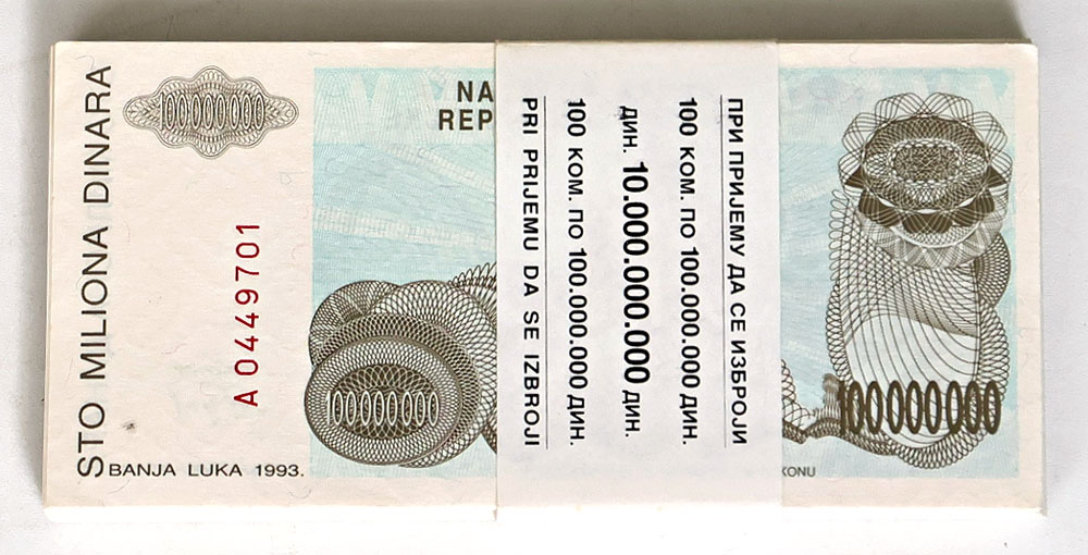 Bosnia and Herzegovina 100,000,000 Dinara 1993 (P 154a), bundle. Uncounted, but appears to have 100 consecutive notes. High retail value of approx $1200.