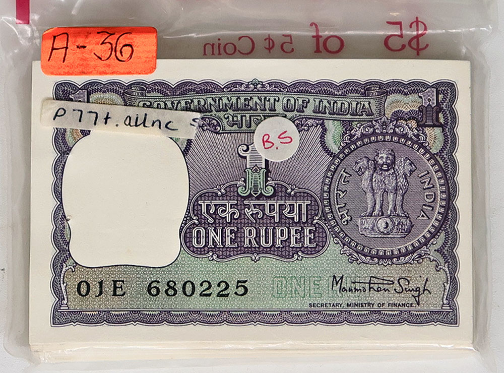 India Government 1 Rupee N/D (1976) (P 77t). Bundle of 100. With official staple holes at left (staples removed).