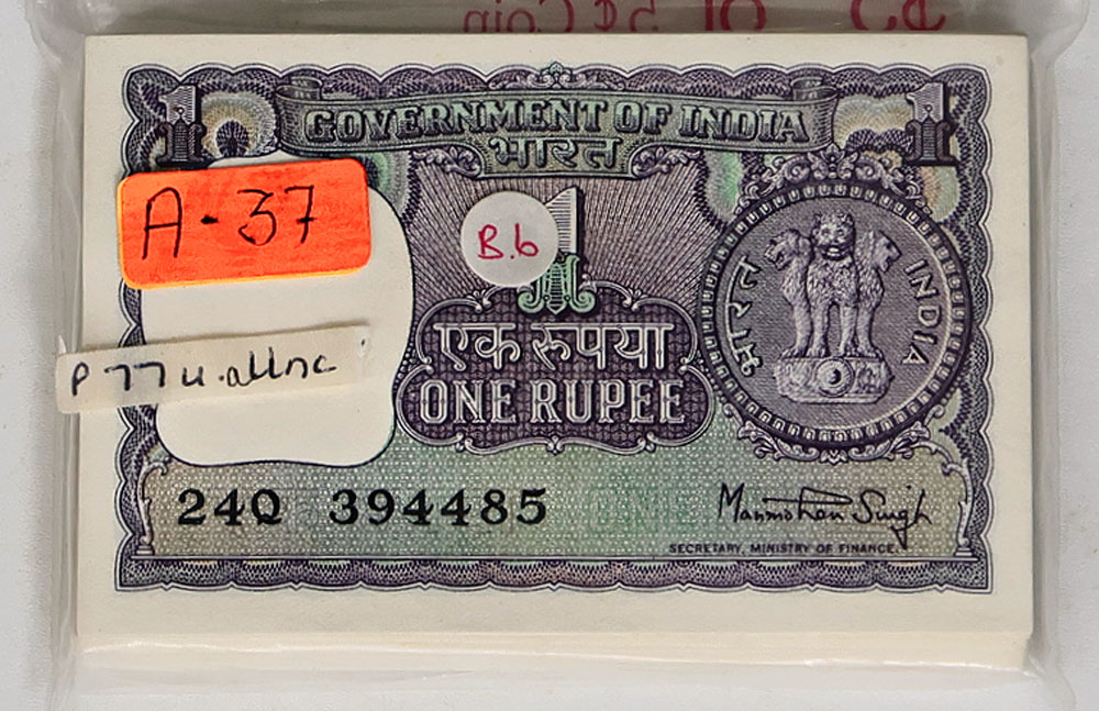 India Government 1 Rupee N/D (1977) (P 77u). Bundle of 100. With official staple holes at left (staples removed).