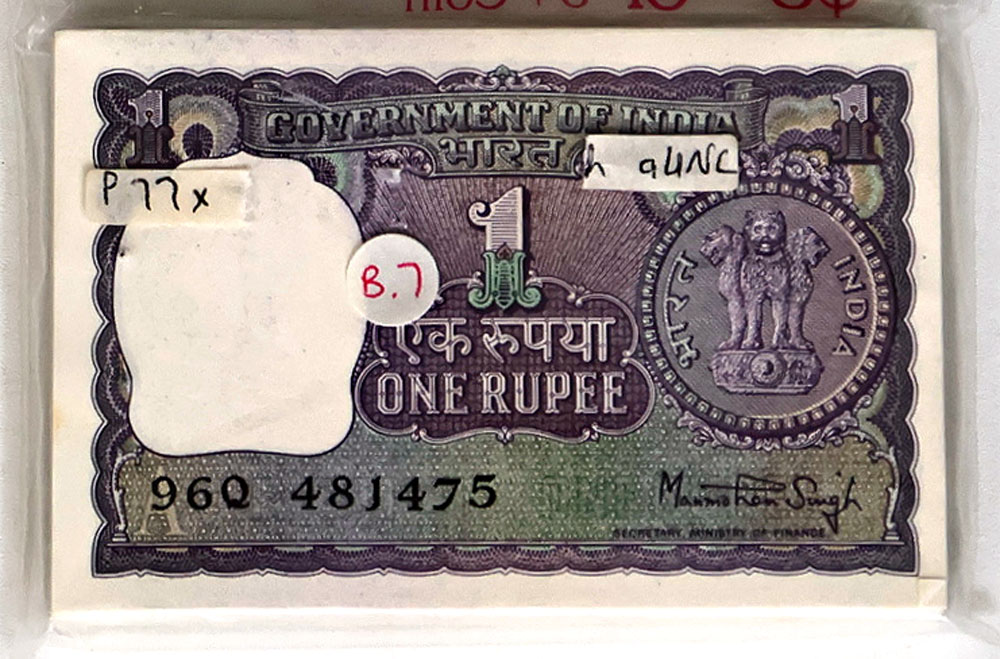India Government 1 Rupee N/D (1980) (P 77x). Bundle of 100. With official staple holes at left (staples removed).