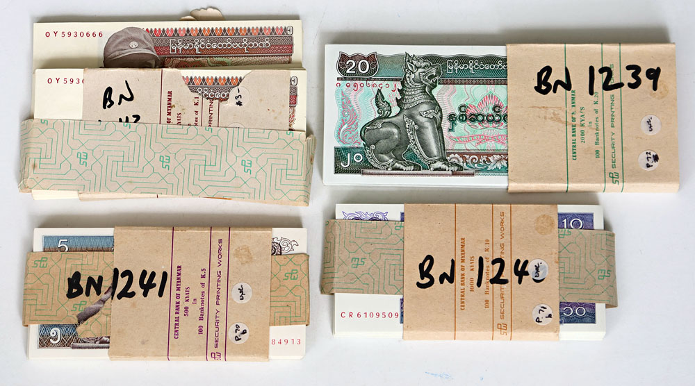 Myanmar 1 Kyat, 5 Kyats, 10 Kyats and 20 Kyats 1996 (P 67, 70b, 71b, 72). Bundle of 100 of each. (4 items total).