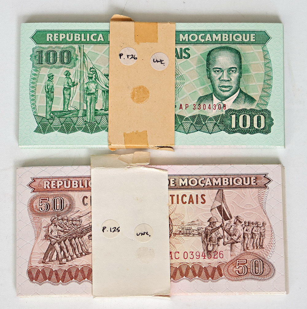 Mozambique 50 Meticais 1980 (P 125) and 100 Meticais 1983 (P 126). Bundle of 100 of each. (2 items total).