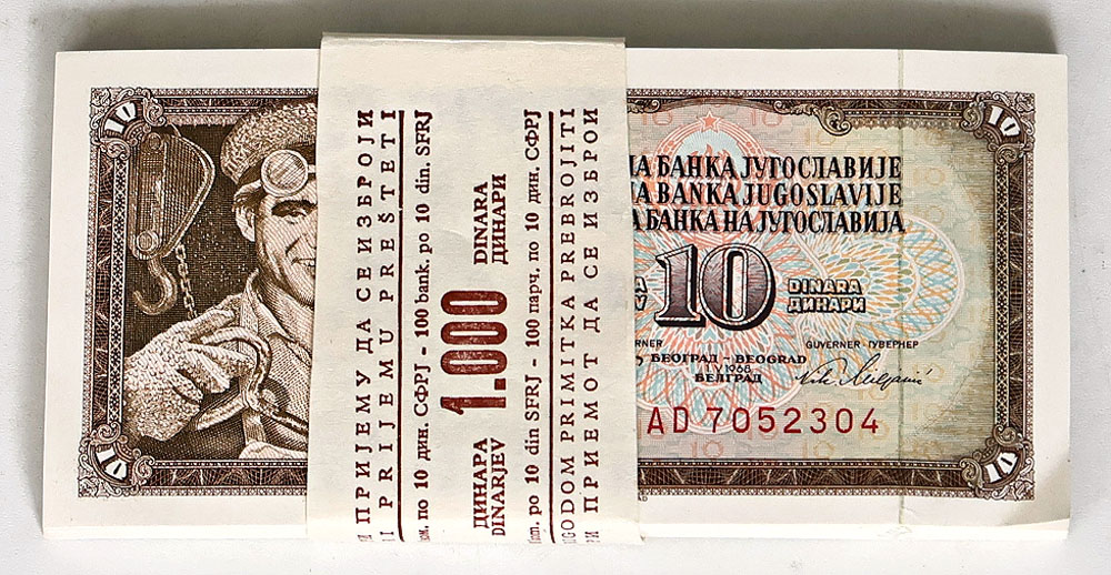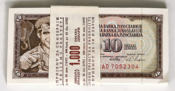 Yugoslavia 10 Dinara 1-5-1968 (P 82c). Bundle of 100, with original bundle wrapper.