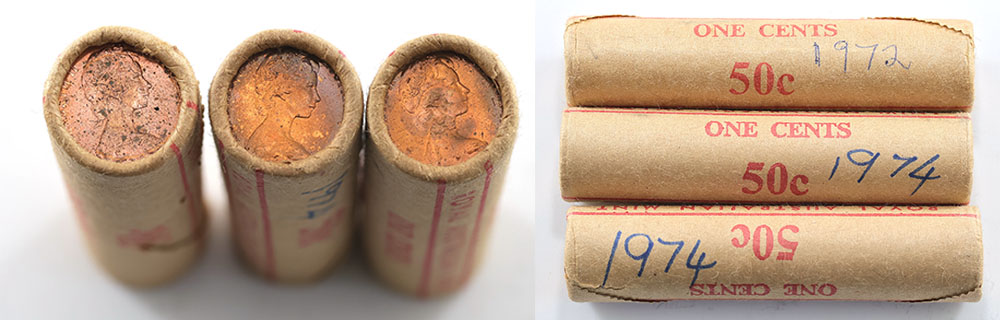 One Cent. 1972, 1974 RAM mint rolls of 50. End...