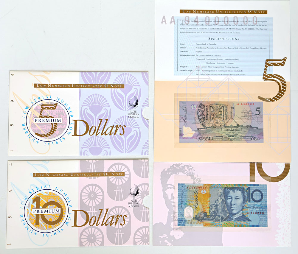 1994 Premium low-numbered 5 and 10 Dollar collector folders with matching red serials: AA 94 000638. In folders of issue. (2 items total).