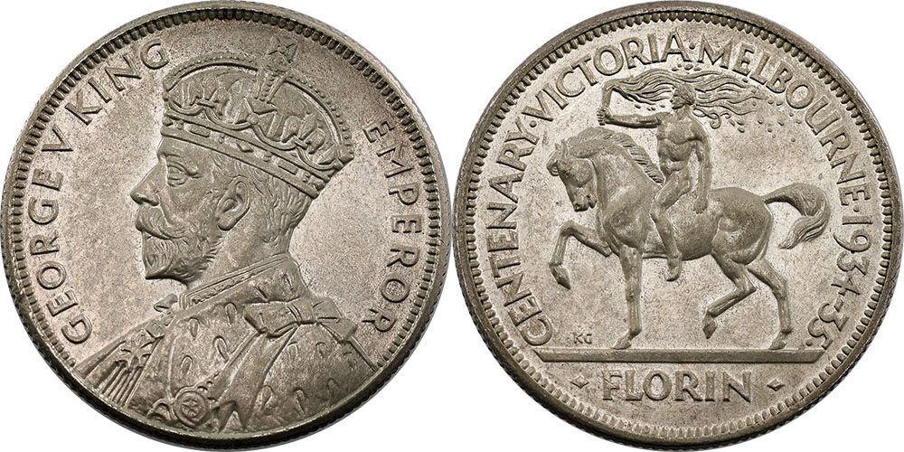 | Description: 1934/35 Melbourne Centenary. Proof-like Type II. With diagnostic die-marker between horses rear and tail. Light old tone with significant underlying lustre and almost full wreath. Scarce. Ch.UNC/GEM |