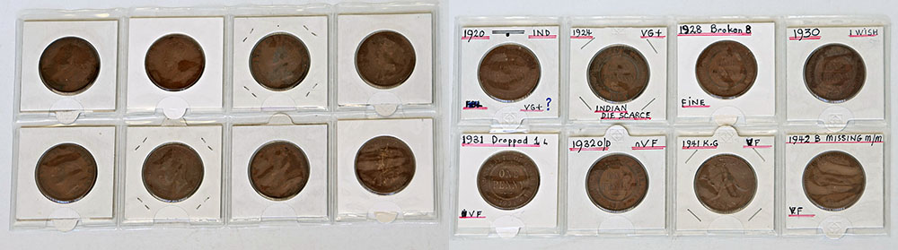 | Description: 1920 Dot Blow, 1924 Indian Obverse, 1928 broken 8, 1930 date altered forgery, 1931 Dropped 1, 1933/2 overdate, 1941 K.G, 1942Y missing I mintmark. (8 coins total). VG-aVF |