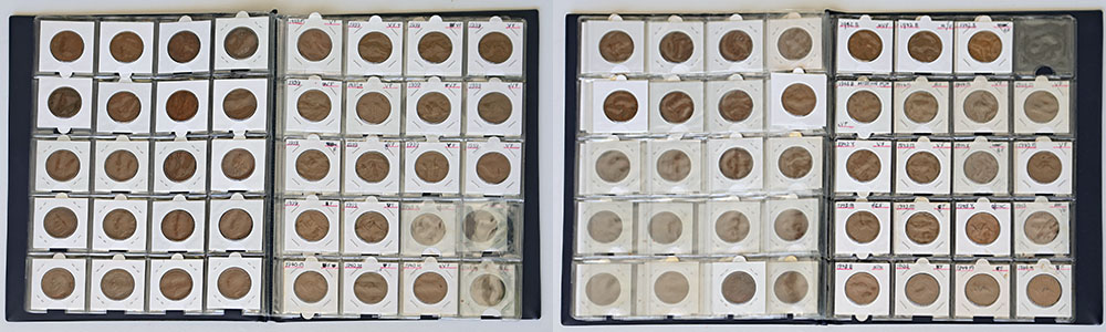| Description: Penny collection, 1923-1945 incomplete but includes many multiples of some dates, mostly Fine to VF. In coin album, each coin in holder and annotated. (77 coins total). VG-aEF |