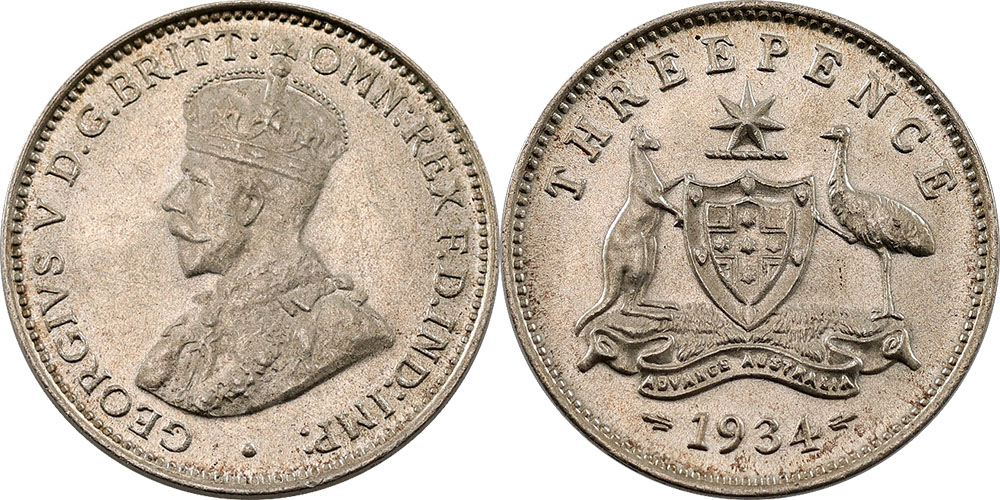 Threepence. 1934/3 Overdate. Toned.