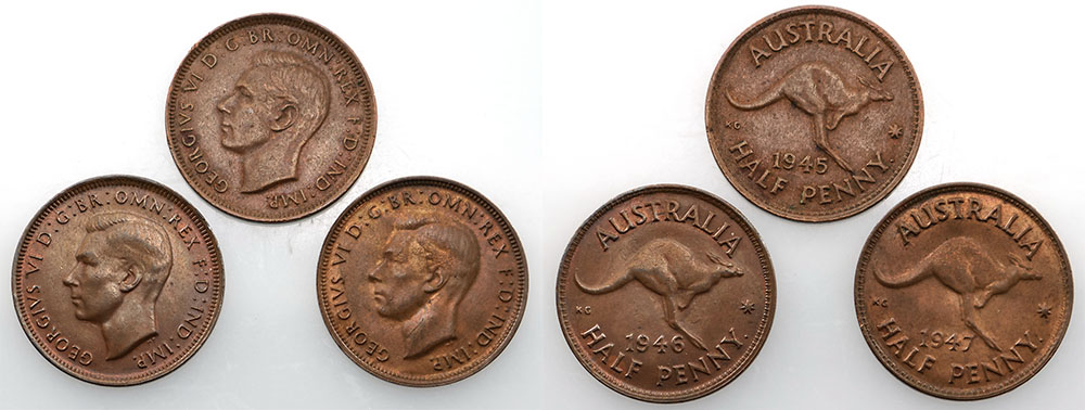 1945Y, 1946Y, 1947Y. Mostly brown. (3 coins total).