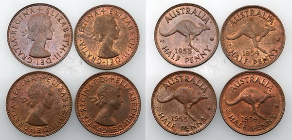 1953A, 1954Y, 1955, 1959. Brown with some mint red. (4 coins total).