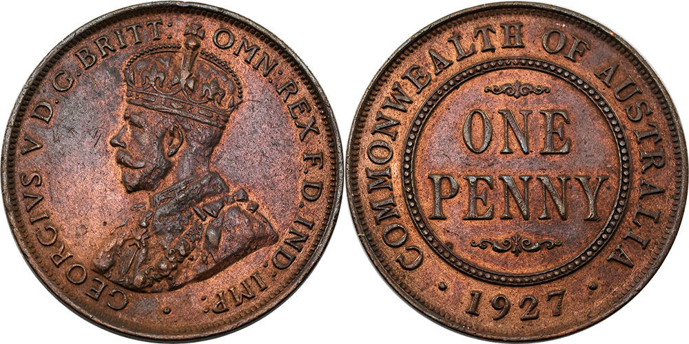 Penny. 1927 Indian Obverse, 1929 English...