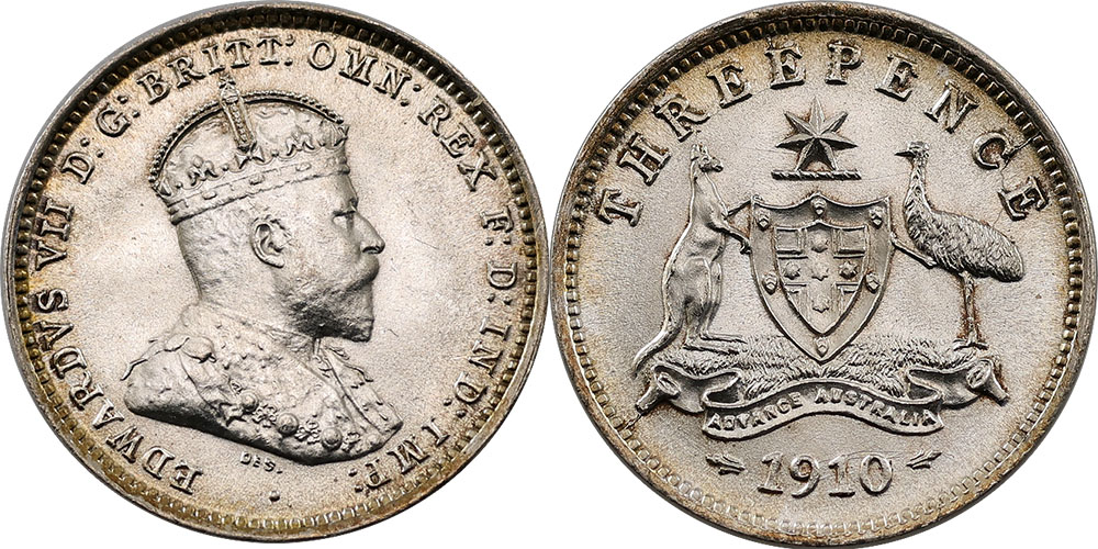 Threepence. 1910. Toned with bloom.